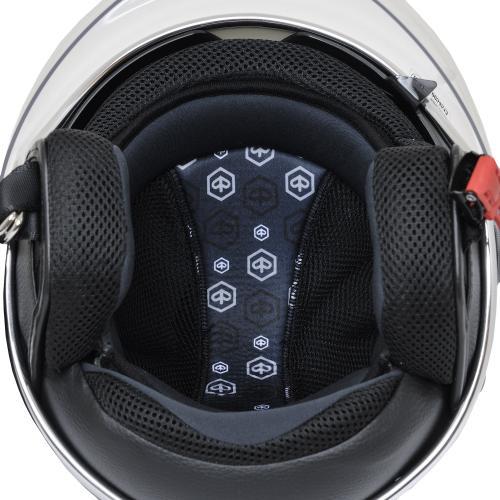 小型单壳式半盔,由ABS材料制成。带有由聚碳酸酯制成的2mm护目镜,具有防刮、防紫外线功能,并采用超轻铝结构,头盔前部带有可收缩的防晒护目镜,具有独特的Exagon图案,带同色系哑光/渐变色贴花,增加Piaggio的现代感和高科技基因,头盔内部采用透气、抗菌的比亚乔定制内衬,并配备微调锁扣,经ECE 22.05标准认证。意大利制造,尺码从XS至XL。